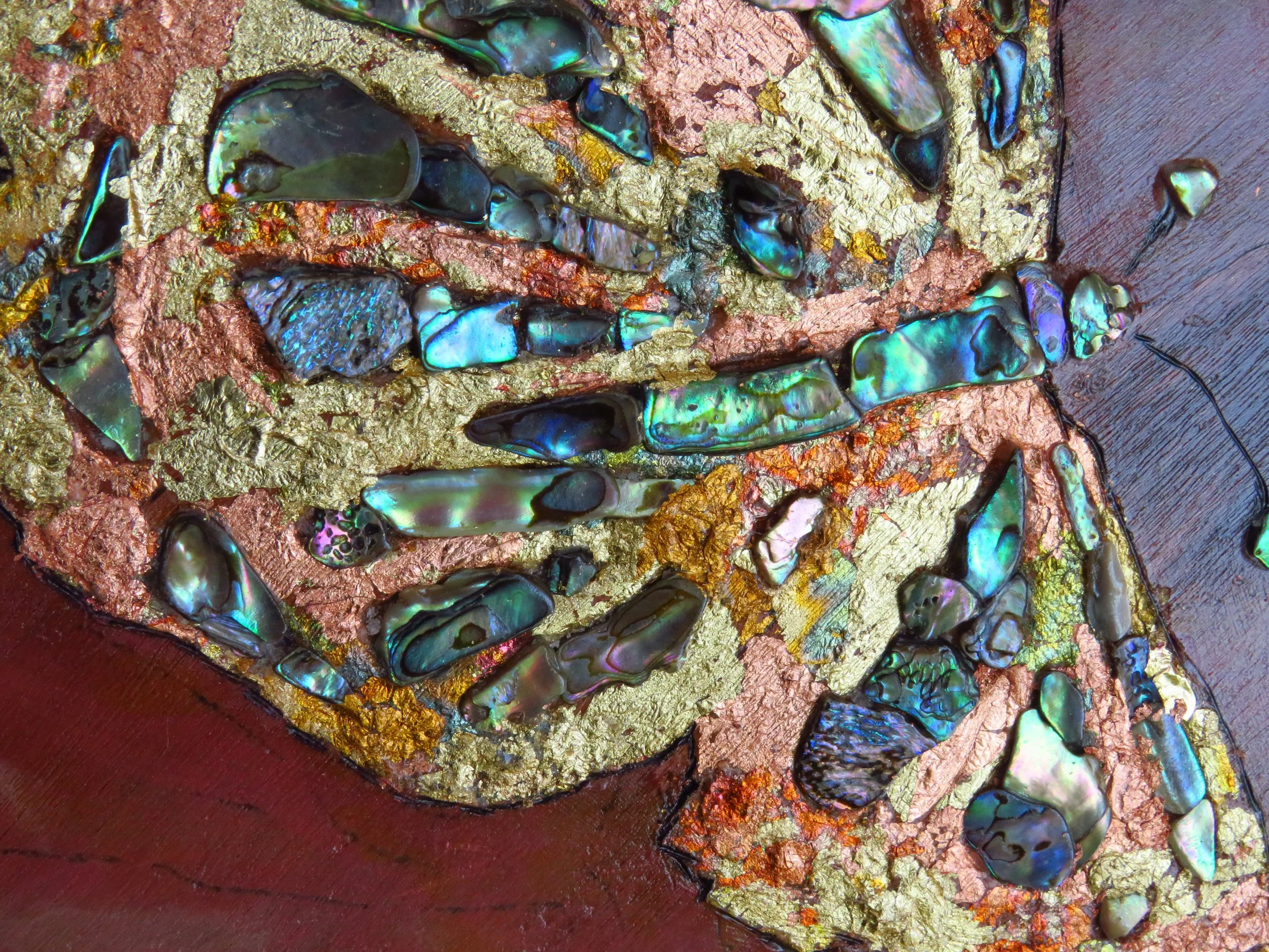 Pyrography, High Fluid Acrylics, Variegated foil, and Paula shells on Patagonia Rosewood slab. This piece was featured at Art Squash 2025 in Enfield, Connecticut. It reflects on someone reaching for their dreams and the forces keeping them just out of reach- yet the dreamer continues to stretch forward in hope.
